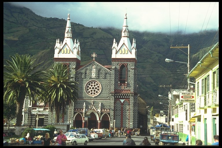 Die Plaza Major in Baños. Die Kirche ist eher untypisch für Ecuador.